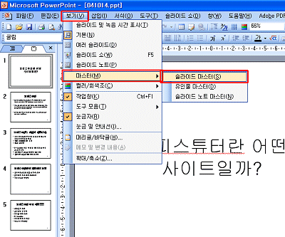 라는 이름으로 저장한 다음, 여러 장의 슬라이드에 동일한 배경 디자인을 적용하기 위해 보기-마스터-슬라이드