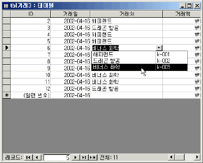 예를 들면, 회사코드가 ‘k-001’ 이고 회사명이 ‘해피랜드’ 라고 할 때 필드에 저장될 실제 값이 회사코드인 경우 사용자에게 k-001을 보여주는 것은 불편할 겁니다. 대신 코드에 대한 설명값인 회사이름을 보여주는 것이 좋겠지요?