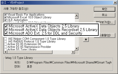 위와 같은 폼을 만들었다면 이제는 코딩에 앞서 ADO를 사용하기 위해 다음과 같이 ADO개체를 참조합니다.