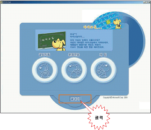 키보드 연습을 모두 마치고 타자교실 프로그램을 끝내려면 오른쪽 하단 메뉴의 끝내기 단추를 선택하세요.