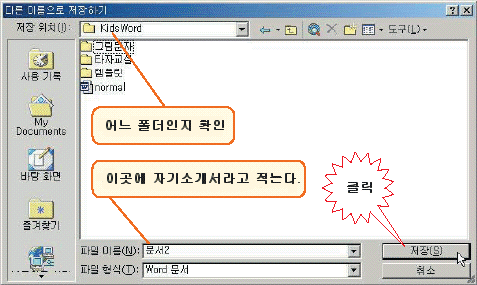 문서 저장 단추를 눌렀을 때 나오는 오른쪽 화면에서 저장한 위치를 눈여겨 둔 다음, 파일 이름에 "자기소개서"라고 적고, 오른쪽 밑의 저장을 누릅니다. 또한, 도구 모음의 문서 저장 아이콘