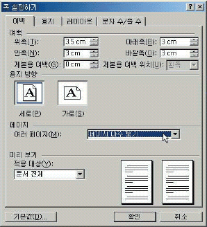 머리글이나 바닥글은 책을 펼쳤을 때 모양이 서로 마주 보는 것이 더 멋있고 어울립니다. 파일 메뉴에서 쪽 설정하기를 선택하고 페이지 마주보기를 지정하면 머리글이나 바닥글 서로 마주보는 모양으로 보이게 됩니다.