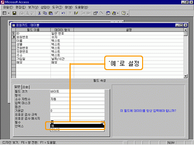 이 속성의 값을 <예>로 설정하면 'Null'값을 허용하지 않으므로 이 속성을 지정한 필드에 데이터를 입력하지 않고 다른 필드로 넘어가면 에러 메시지가 나타납니다. 이 기능은 테이블에서 꼭 입력해야 되는 필드에 설정하면 편리하게 사용할 수 있습니다.