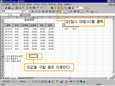 여기에서는 인천 지역의 출장 경비 총 합계를 구하는
