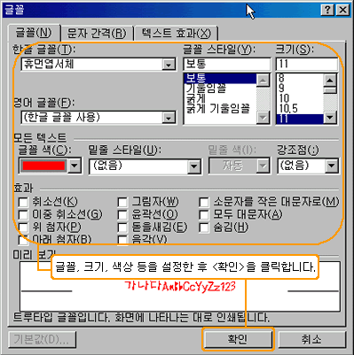글꼴, 크기, 색상 등을 설정한 후 <확인>을