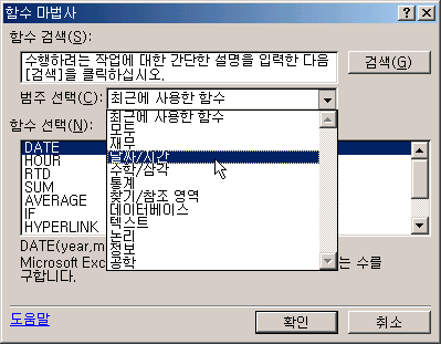 ② 함수 마법사 대화 상자가 나타나면 범주 선택의 드롭다운 단추를 클릭하여 목록에서 함수 범주를 선택할 수
