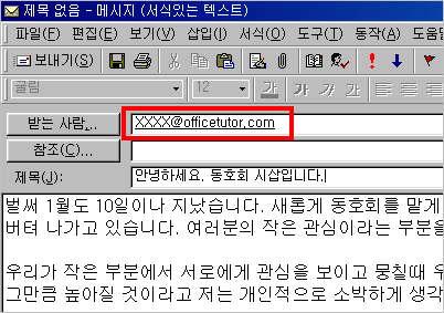 ③ 메시지 창이 열리면 [받는 사람]주소가 자동으로 입력됩니다. 제목과 메시지 내용을 입력하고, [보내기]단추를 누릅니다.