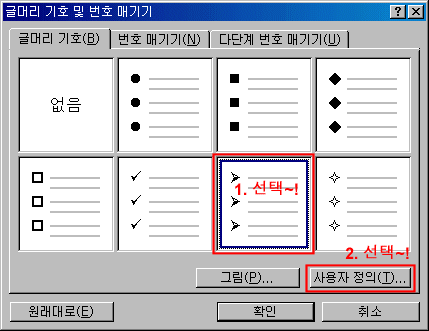 ⑧ [글머리 기호]탭에서 사용할 글머리 기호를 선택한 후 [사용자 정의]단추를 클릭합니다.